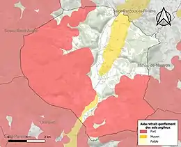 Les mouvements de terrains susceptibles de se produire sur la commune sont des tassements différentiels[41]. Le retrait-gonflement des sols argileux est susceptible d'engendrer des dommages importants aux bâtiments en cas d’alternance de périodes de sécheresse et de pluie[42]. 69,1 % de la superficie communale est en aléa moyen ou fort (58,6 % au niveau départemental et 48,5 % au niveau national métropolitain)[Carte 4]. Depuis le , en application de la loi ÉLAN, différentes contraintes s'imposent aux vendeurs, maîtres d'ouvrages ou constructeurs de biens situés dans une zone classée en aléa moyen ou fort[Note 5],[43].