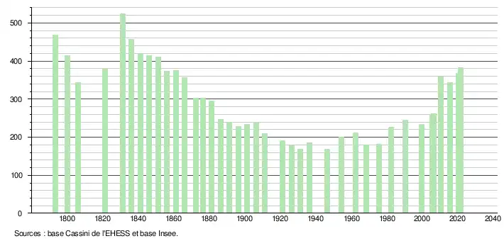 L'évolution du nombre d'habitants est connue à travers les recensements de la population effectués dans la commune depuis 1793. Pour les communes de moins de 10 000 habitants, une enquête de recensement portant sur toute la population est réalisée tous les cinq ans, les populations légales des années intermédiaires étant quant à elles estimées par interpolation ou extrapolation[23]. Pour la commune, le premier recensement exhaustif entrant dans le cadre du nouveau dispositif a été réalisé en 2005[24].