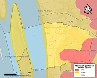 Le retrait-gonflement des sols argileux est susceptible d'engendrer des dommages importants aux bâtiments en cas d’alternance de périodes de sécheresse et de pluie. 73,8 % de la superficie communale est en aléa moyen ou fort (67,4 % au niveau départemental et 48,5 % au niveau national). Sur les 244 bâtiments dénombrés sur la commune en 2019, 244 sont en aléa moyen ou fort, soit 100 %, à comparer aux 84 % au niveau départemental et 54 % au niveau national. Une cartographie de l'exposition du territoire national au retrait gonflement des sols argileux est disponible sur le site du BRGM[27],[Carte 2].