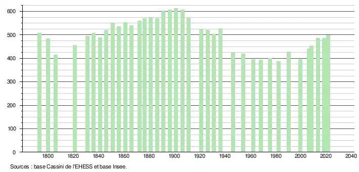 L'évolution du nombre d'habitants est connue à travers les recensements de la population effectués dans la commune depuis 1793. Pour les communes de moins de 10 000 habitants, une enquête de recensement portant sur toute la population est réalisée tous les cinq ans, les populations légales des années intermédiaires étant quant à elles estimées par interpolation ou extrapolation[35]. Pour la commune, le premier recensement exhaustif entrant dans le cadre du nouveau dispositif a été réalisé en 2008[36].