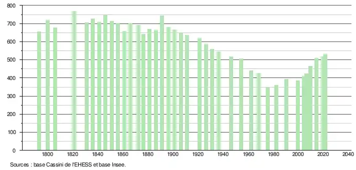 L'évolution du nombre d'habitants est connue à travers les recensements de la population effectués dans la commune depuis 1793. Pour les communes de moins de 10 000 habitants, une enquête de recensement portant sur toute la population est réalisée tous les cinq ans, les populations légales des années intermédiaires étant quant à elles estimées par interpolation ou extrapolation[22]. Pour la commune, le premier recensement exhaustif entrant dans le cadre du nouveau dispositif a été réalisé en 2004[23].