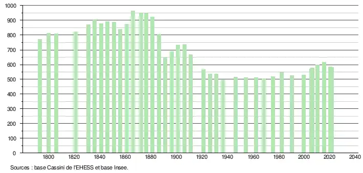 L'évolution du nombre d'habitants est connue à travers les recensements de la population effectués dans la commune depuis 1793. Pour les communes de moins de 10 000 habitants, une enquête de recensement portant sur toute la population est réalisée tous les cinq ans, les populations légales des années intermédiaires étant quant à elles estimées par interpolation ou extrapolation[29]. Pour la commune, le premier recensement exhaustif entrant dans le cadre du nouveau dispositif a été réalisé en 2005[30].