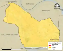 La commune est vulnérable au risque de mouvements de terrains constitué principalement du retrait-gonflement des sols argileux[19]. Cet aléa est susceptible d'engendrer des dommages importants aux bâtiments en cas d’alternance de périodes de sécheresse et de pluie. 96,6 % de la superficie communale est en aléa moyen ou fort (67,5 % au niveau départemental et 48,5 % au niveau national). Sur les 761 bâtiments dénombrés sur la commune en 2019, 761 sont en aléa moyen ou fort, soit 100 %, à comparer aux 90 % au niveau départemental et 54 % au niveau national. Une cartographie de l'exposition du territoire national au retrait gonflement des sols argileux est disponible sur le site du BRGM[20],[Carte 2].