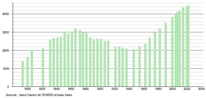 L'évolution du nombre d'habitants est connue à travers les recensements de la population effectués dans la commune depuis 1793. Pour les communes de moins de 10 000 habitants, une enquête de recensement portant sur toute la population est réalisée tous les cinq ans, les populations légales des années intermédiaires étant quant à elles estimées par interpolation ou extrapolation[36]. Pour la commune, le premier recensement exhaustif entrant dans le cadre du nouveau dispositif a été réalisé en 2004[37].