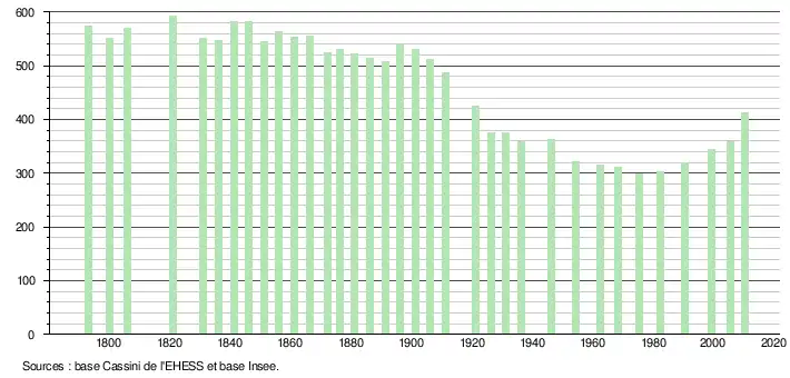 L'évolution du nombre d'habitants est connue à travers les recensements de la population effectués dans la commune depuis 1793. À partir du , les populations légales des communes sont publiées annuellement dans le cadre d'un recensement qui repose désormais sur une collecte d'information annuelle, concernant successivement tous les territoires communaux au cours d'une période de cinq ans. Pour les communes de moins de 10 000 habitants, une enquête de recensement portant sur toute la population est réalisée tous les cinq ans, les populations légales des années intermédiaires étant quant à elles estimées par interpolation ou extrapolation[8]. Pour la commune, le premier recensement exhaustif entrant dans le cadre du nouveau dispositif a été réalisé en 2005[9],[Note 1].