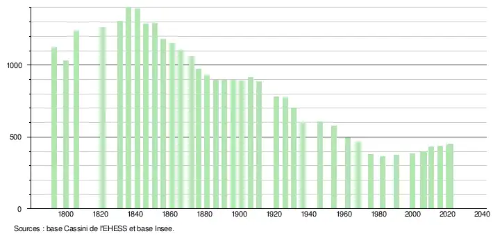 L'évolution du nombre d'habitants est connue à travers les recensements de la population effectués dans la commune depuis 1793. Pour les communes de moins de 10 000 habitants, une enquête de recensement portant sur toute la population est réalisée tous les cinq ans, les populations légales des années intermédiaires étant quant à elles estimées par interpolation ou extrapolation[18]. Pour la commune, le premier recensement exhaustif entrant dans le cadre du nouveau dispositif a été réalisé en 2005[19].
