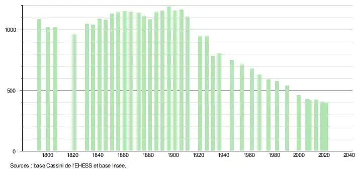 L'évolution du nombre d'habitants est connue à travers les recensements de la population effectués dans la commune depuis 1793. Pour les communes de moins de 10 000 habitants, une enquête de recensement portant sur toute la population est réalisée tous les cinq ans, les populations légales des années intermédiaires étant quant à elles estimées par interpolation ou extrapolation[14]. Pour la commune, le premier recensement exhaustif entrant dans le cadre du nouveau dispositif a été réalisé en 2008[15].