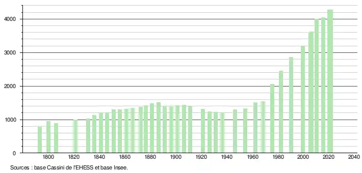 L'évolution du nombre d'habitants est connue à travers les recensements de la population effectués dans la commune depuis 1793. Pour les communes de moins de 10 000 habitants, une enquête de recensement portant sur toute la population est réalisée tous les cinq ans, les populations légales des années intermédiaires étant quant à elles estimées par interpolation ou extrapolation[43]. Pour la commune, le premier recensement exhaustif entrant dans le cadre du nouveau dispositif a été réalisé en 2005[44].