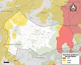 Les mouvements de terrains susceptibles de se produire sur la commune sont des affaissements et effondrements liés aux cavités souterraines (hors mines) et des tassements différentiels[27]. Afin de mieux appréhender le risque d’affaissement de terrain, un inventaire national permet de localiser les éventuelles cavités souterraines sur la commune[28]. Le retrait-gonflement des sols argileux est susceptible d'engendrer des dommages importants aux bâtiments en cas d’alternance de périodes de sécheresse et de pluie[29]. 32,3 % de la superficie communale est en aléa moyen ou fort (79,5 % au niveau départemental et 48,5 % au niveau national)[Carte 2]. Depuis le , en application de la loi ÉLAN, différentes contraintes s'imposent aux vendeurs, maîtres d'ouvrages ou constructeurs de biens situés dans une zone classée en aléa moyen ou fort[Note 4],[30].