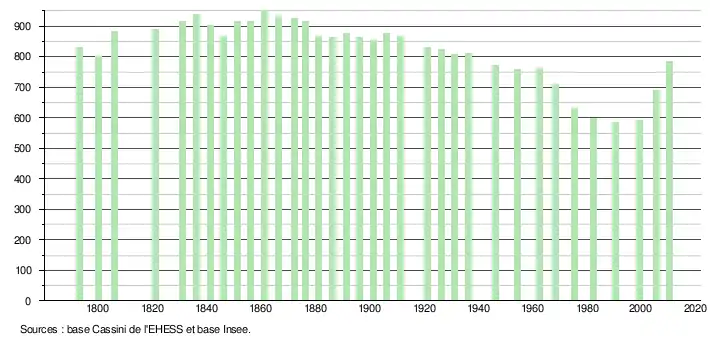 L'évolution du nombre d'habitants est connue à travers les recensements de la population effectués dans la commune depuis 1793. À partir du , les populations légales des communes sont publiées annuellement dans le cadre d'un recensement qui repose désormais sur une collecte d'information annuelle, concernant successivement tous les territoires communaux au cours d'une période de cinq ans. Pour les communes de moins de 10 000 habitants, une enquête de recensement portant sur toute la population est réalisée tous les cinq ans, les populations légales des années intermédiaires étant quant à elles estimées par interpolation ou extrapolation[11]. Pour la commune, le premier recensement exhaustif entrant dans le cadre du nouveau dispositif a été réalisé en 2005[12],[Note 1].