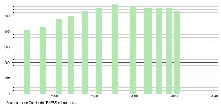 L'évolution du nombre d'habitants est connue à travers les recensements de la population effectués dans la commune depuis 1946. Pour les communes de moins de 10 000 habitants, une enquête de recensement portant sur toute la population est réalisée tous les cinq ans, les populations légales des années intermédiaires étant quant à elles estimées par interpolation ou extrapolation[32]. Pour la commune, le premier recensement exhaustif entrant dans le cadre du nouveau dispositif a été réalisé en 2007[33].