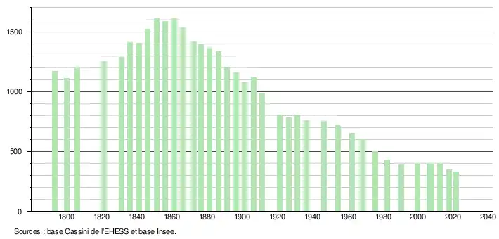 L'évolution du nombre d'habitants est connue à travers les recensements de la population effectués dans la commune depuis 1793. Pour les communes de moins de 10 000 habitants, une enquête de recensement portant sur toute la population est réalisée tous les cinq ans, les populations légales des années intermédiaires étant quant à elles estimées par interpolation ou extrapolation[16]. Pour la commune, le premier recensement exhaustif entrant dans le cadre du nouveau dispositif a été réalisé en 2007[17].