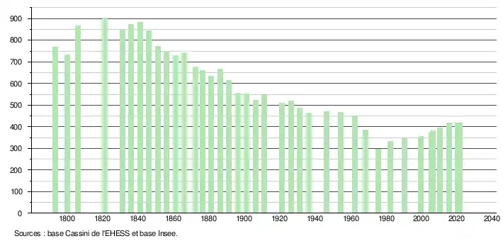 L'évolution du nombre d'habitants est connue à travers les recensements de la population effectués dans la commune depuis 1793. Pour les communes de moins de 10 000 habitants, une enquête de recensement portant sur toute la population est réalisée tous les cinq ans, les populations légales des années intermédiaires étant quant à elles estimées par interpolation ou extrapolation[22]. Pour la commune, le premier recensement exhaustif entrant dans le cadre du nouveau dispositif a été réalisé en 2005[23].