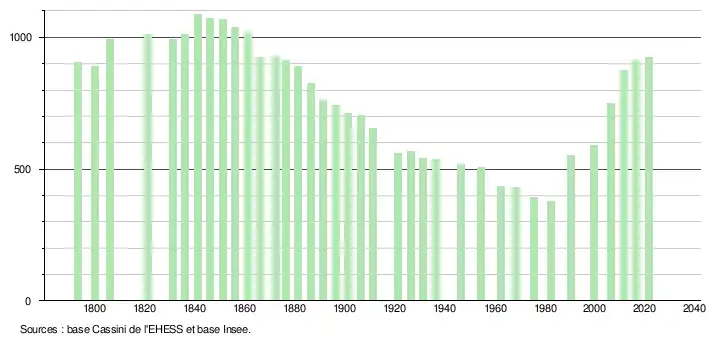 | L'évolution du nombre d'habitants est connue à travers les recensements de la population effectués dans la commune depuis 1793. Pour les communes de moins de 10 000 habitants, une enquête de recensement portant sur toute la population est réalisée tous les cinq ans, les populations légales des années intermédiaires étant quant à elles estimées par interpolation ou extrapolation[27]. Pour la commune, le premier recensement exhaustif entrant dans le cadre du nouveau dispositif a été réalisé en 2006[28]. En 2021, la commune comptait 924 habitants[Note 6], en augmentation de 1,76 % par rapport à 2015 (Tarn : +1,82 %, France hors Mayotte : +1,84 %). |