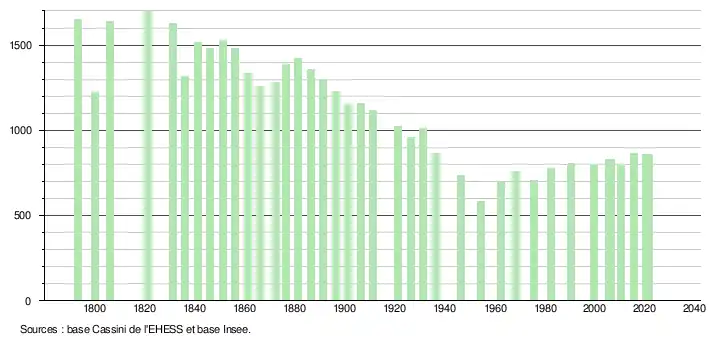 L'évolution du nombre d'habitants est connue à travers les recensements de la population effectués dans la commune depuis 1793. Pour les communes de moins de 10 000 habitants, une enquête de recensement portant sur toute la population est réalisée tous les cinq ans, les populations légales des années intermédiaires étant quant à elles estimées par interpolation ou extrapolation[33]. Pour la commune, le premier recensement exhaustif entrant dans le cadre du nouveau dispositif a été réalisé en 2005[34].