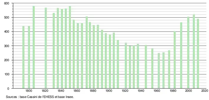 L'évolution du nombre d'habitants est connue à travers les recensements de la population effectués dans la commune depuis 1793. À partir du , les populations légales des communes sont publiées annuellement dans le cadre d'un recensement qui repose désormais sur une collecte d'information annuelle, concernant successivement tous les territoires communaux au cours d'une période de cinq ans. Pour les communes de moins de 10 000 habitants, une enquête de recensement portant sur toute la population est réalisée tous les cinq ans, les populations légales des années intermédiaires étant quant à elles estimées par interpolation ou extrapolation[4]. Pour la commune, le premier recensement exhaustif entrant dans le cadre du nouveau dispositif a été réalisé en 2006[5],[Note 1].