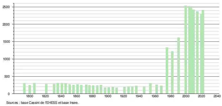 L'évolution du nombre d'habitants est connue à travers les recensements de la population effectués dans la commune depuis 1793. Pour les communes de moins de 10 000 habitants, une enquête de recensement portant sur toute la population est réalisée tous les cinq ans, les populations légales des années intermédiaires étant quant à elles estimées par interpolation ou extrapolation[26]. Pour la commune, le premier recensement exhaustif entrant dans le cadre du nouveau dispositif a été réalisé en 2004[27].
