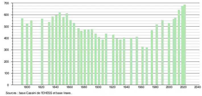 L'évolution du nombre d'habitants est connue à travers les recensements de la population effectués dans la commune depuis 1793. Pour les communes de moins de 10 000 habitants, une enquête de recensement portant sur toute la population est réalisée tous les cinq ans, les populations légales des années intermédiaires étant quant à elles estimées par interpolation ou extrapolation[19]. Pour la commune, le premier recensement exhaustif entrant dans le cadre du nouveau dispositif a été réalisé en 2008[20].