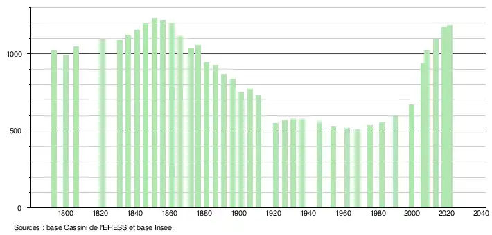 L'évolution du nombre d'habitants est connue à travers les recensements de la population effectués dans la commune depuis 1793. Pour les communes de moins de 10 000 habitants, une enquête de recensement portant sur toute la population est réalisée tous les cinq ans, les populations légales des années intermédiaires étant quant à elles estimées par interpolation ou extrapolation[18]. Pour la commune, le premier recensement exhaustif entrant dans le cadre du nouveau dispositif a été réalisé en 2008[19].