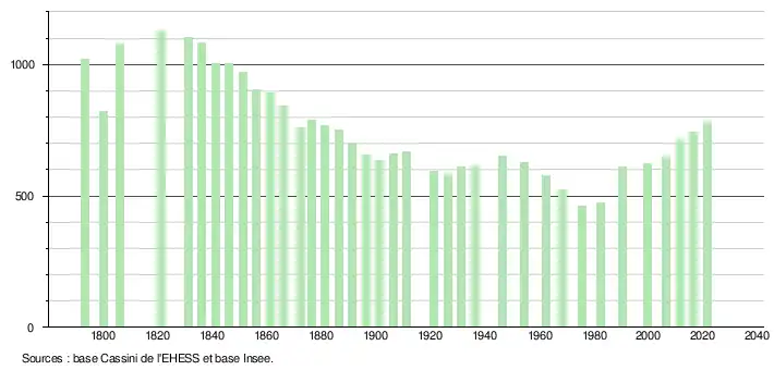 L'évolution du nombre d'habitants est connue à travers les recensements de la population effectués dans la commune depuis 1793. Pour les communes de moins de 10 000 habitants, une enquête de recensement portant sur toute la population est réalisée tous les cinq ans, les populations légales des années intermédiaires étant quant à elles estimées par interpolation ou extrapolation[23]. Pour la commune, le premier recensement exhaustif entrant dans le cadre du nouveau dispositif a été réalisé en 2006[24].