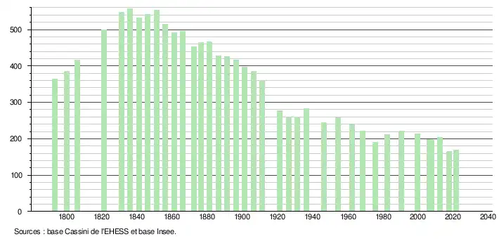 L'évolution du nombre d'habitants est connue à travers les recensements de la population effectués dans la commune depuis 1793. Pour les communes de moins de 10 000 habitants, une enquête de recensement portant sur toute la population est réalisée tous les cinq ans, les populations légales des années intermédiaires étant quant à elles estimées par interpolation ou extrapolation[23]. Pour la commune, le premier recensement exhaustif entrant dans le cadre du nouveau dispositif a été réalisé en 2007[24].