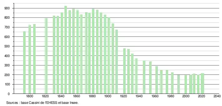 L'évolution du nombre d'habitants est connue à travers les recensements de la population effectués dans la commune depuis 1793. Pour les communes de moins de 10 000 habitants, une enquête de recensement portant sur toute la population est réalisée tous les cinq ans, les populations légales des années intermédiaires étant quant à elles estimées par interpolation ou extrapolation[14]. Pour la commune, le premier recensement exhaustif entrant dans le cadre du nouveau dispositif a été réalisé en 2005[15].