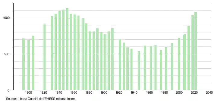 L'évolution du nombre d'habitants est connue à travers les recensements de la population effectués dans la commune depuis 1793. Pour les communes de moins de 10 000 habitants, une enquête de recensement portant sur toute la population est réalisée tous les cinq ans, les populations légales des années intermédiaires étant quant à elles estimées par interpolation ou extrapolation[20]. Pour la commune, le premier recensement exhaustif entrant dans le cadre du nouveau dispositif a été réalisé en 2007[21].