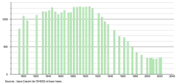 L'évolution du nombre d'habitants est connue à travers les recensements de la population effectués dans la commune depuis 1793. Pour les communes de moins de 10 000 habitants, une enquête de recensement portant sur toute la population est réalisée tous les cinq ans, les populations légales des années intermédiaires étant quant à elles estimées par interpolation ou extrapolation[20]. Pour la commune, le premier recensement exhaustif entrant dans le cadre du nouveau dispositif a été réalisé en 2004[21].