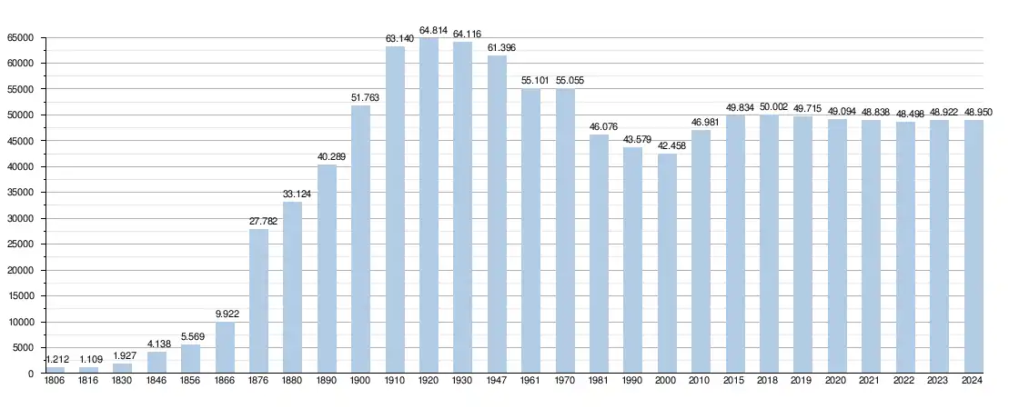 | Habitants | 1 927 | 4 138 | 5 569 | 9 922 | 27 782 | 33 124 | 40 289 | 51 763 | 63 140 | 64 814 | 64 116 | 61 396 | 55 101 | 55 055 | 47 932 | 43 579 | ||||||||||||||