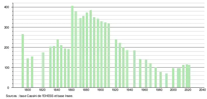 L'évolution du nombre d'habitants est connue à travers les recensements de la population effectués dans la commune depuis 1793. Pour les communes de moins de 10 000 habitants, une enquête de recensement portant sur toute la population est réalisée tous les cinq ans, les populations légales des années intermédiaires étant quant à elles estimées par interpolation ou extrapolation[15]. Pour la commune, le premier recensement exhaustif entrant dans le cadre du nouveau dispositif a été réalisé en 2008[16].