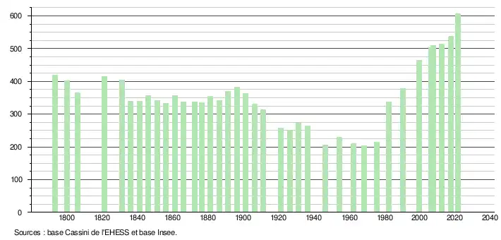 L'évolution du nombre d'habitants est connue à travers les recensements de la population effectués dans la commune depuis 1793. Pour les communes de moins de 10 000 habitants, une enquête de recensement portant sur toute la population est réalisée tous les cinq ans, les populations légales des années intermédiaires étant quant à elles estimées par interpolation ou extrapolation[16]. Pour la commune, le premier recensement exhaustif entrant dans le cadre du nouveau dispositif a été réalisé en 2007[17].