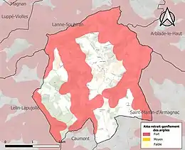 Le retrait-gonflement des sols argileux est susceptible d'engendrer des dommages importants aux bâtiments en cas d’alternance de périodes de sécheresse et de pluie. 60,4 % de la superficie communale est en aléa moyen ou fort (94,5 % au niveau départemental et 48,5 % au niveau national). Sur les 63 bâtiments dénombrés sur la commune en 2019, 14 sont en aléa moyen ou fort, soit 22 %, à comparer aux 93 % au niveau départemental et 54 % au niveau national. Une cartographie de l'exposition du territoire national au retrait gonflement des sols argileux est disponible sur le site du BRGM[19],[Carte 3].