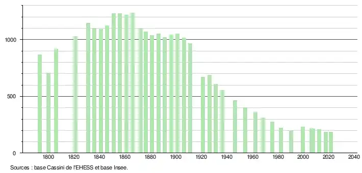 L'évolution du nombre d'habitants est connue à travers les recensements de la population effectués dans la commune depuis 1793. Pour les communes de moins de 10 000 habitants, une enquête de recensement portant sur toute la population est réalisée tous les cinq ans, les populations légales des années intermédiaires étant quant à elles estimées par interpolation ou extrapolation[24]. Pour la commune, le premier recensement exhaustif entrant dans le cadre du nouveau dispositif a été réalisé en 2007[25].