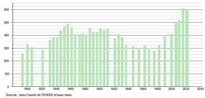 L'évolution du nombre d'habitants est connue à travers les recensements de la population effectués dans la commune depuis 1793. Pour les communes de moins de 10 000 habitants, une enquête de recensement portant sur toute la population est réalisée tous les cinq ans, les populations légales des années intermédiaires étant quant à elles estimées par interpolation ou extrapolation[20]. Pour la commune, le premier recensement exhaustif entrant dans le cadre du nouveau dispositif a été réalisé en 2005[21].