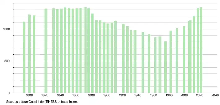 L'évolution du nombre d'habitants est connue à travers les recensements de la population effectués dans la commune depuis 1793. Pour les communes de moins de 10 000 habitants, une enquête de recensement portant sur toute la population est réalisée tous les cinq ans, les populations légales des années intermédiaires étant quant à elles estimées par interpolation ou extrapolation[18]. Pour la commune, le premier recensement exhaustif entrant dans le cadre du nouveau dispositif a été réalisé en 2007[19].