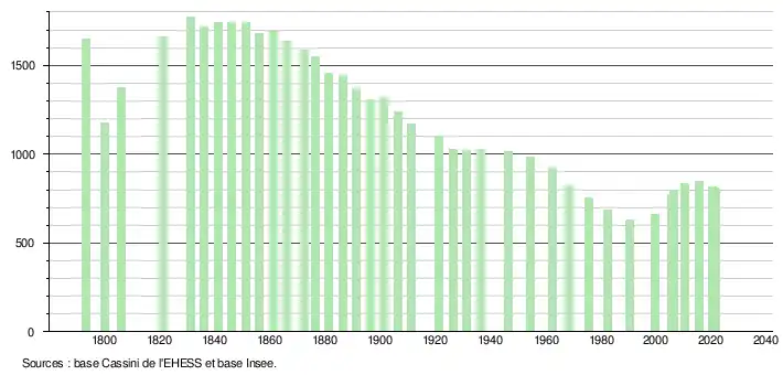 L'évolution du nombre d'habitants est connue à travers les recensements de la population effectués dans la commune depuis 1793. Pour les communes de moins de 10 000 habitants, une enquête de recensement portant sur toute la population est réalisée tous les cinq ans, les populations légales des années intermédiaires étant quant à elles estimées par interpolation ou extrapolation[30]. Pour la commune, le premier recensement exhaustif entrant dans le cadre du nouveau dispositif a été réalisé en 2005[31].