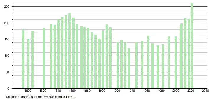 L'évolution du nombre d'habitants est connue à travers les recensements de la population effectués dans la commune depuis 1793. Pour les communes de moins de 10 000 habitants, une enquête de recensement portant sur toute la population est réalisée tous les cinq ans, les populations légales des années intermédiaires étant quant à elles estimées par interpolation ou extrapolation[18]. Pour la commune, le premier recensement exhaustif entrant dans le cadre du nouveau dispositif a été réalisé en 2007[19].
