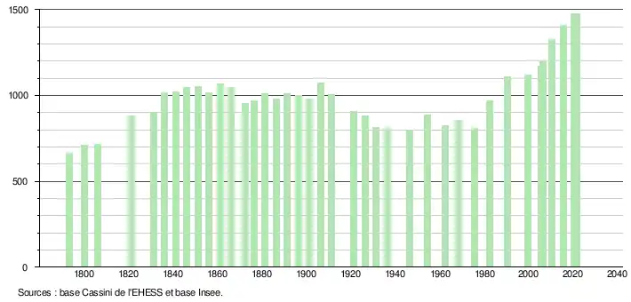L'évolution du nombre d'habitants est connue à travers les recensements de la population effectués dans la commune depuis 1793. Pour les communes de moins de 10 000 habitants, une enquête de recensement portant sur toute la population est réalisée tous les cinq ans, les populations légales des années intermédiaires étant quant à elles estimées par interpolation ou extrapolation[22]. Pour la commune, le premier recensement exhaustif entrant dans le cadre du nouveau dispositif a été réalisé en 2005[23].