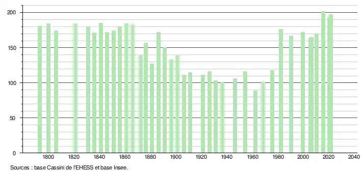 L'évolution du nombre d'habitants est connue à travers les recensements de la population effectués dans la commune depuis 1793. Pour les communes de moins de 10 000 habitants, une enquête de recensement portant sur toute la population est réalisée tous les cinq ans, les populations légales des années intermédiaires étant quant à elles estimées par interpolation ou extrapolation[19]. Pour la commune, le premier recensement exhaustif entrant dans le cadre du nouveau dispositif a été réalisé en 2005[20].