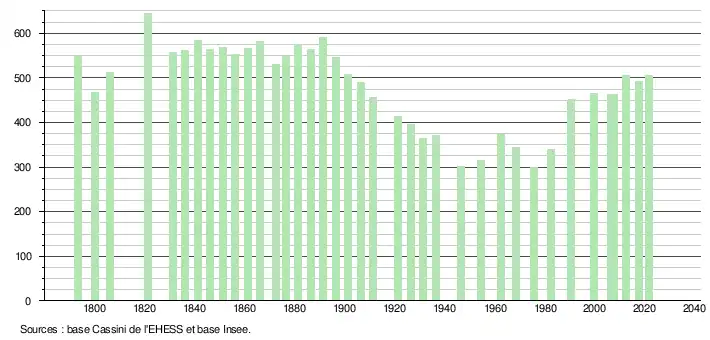 L'évolution du nombre d'habitants est connue à travers les recensements de la population effectués dans la commune depuis 1793. Pour les communes de moins de 10 000 habitants, une enquête de recensement portant sur toute la population est réalisée tous les cinq ans, les populations légales des années intermédiaires étant quant à elles estimées par interpolation ou extrapolation[20]. Pour la commune, le premier recensement exhaustif entrant dans le cadre du nouveau dispositif a été réalisé en 2007[21].