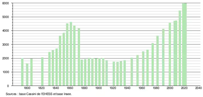L'évolution du nombre d'habitants est connue à travers les recensements de la population effectués dans la commune depuis 1793. Pour les communes de moins de 10 000 habitants, une enquête de recensement portant sur toute la population est réalisée tous les cinq ans, les populations légales des années intermédiaires étant quant à elles estimées par interpolation ou extrapolation[25]. Pour la commune, le premier recensement exhaustif entrant dans le cadre du nouveau dispositif a été réalisé en 2008[26].