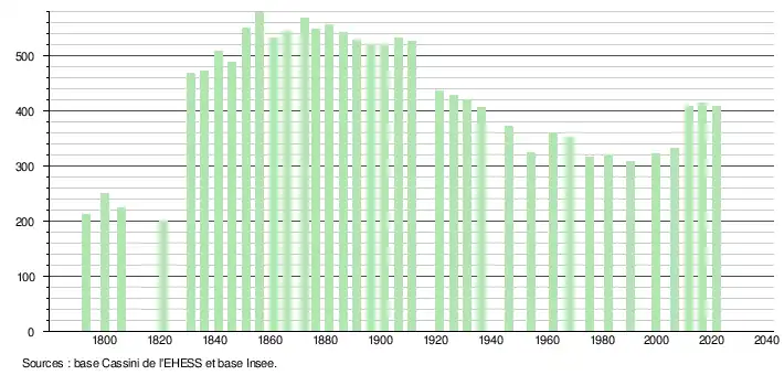 | L'évolution du nombre d'habitants est connue à travers les recensements de la population effectués dans la commune depuis 1793. Pour les communes de moins de 10 000 habitants, une enquête de recensement portant sur toute la population est réalisée tous les cinq ans, les populations légales des années intermédiaires étant quant à elles estimées par interpolation ou extrapolation[22]. Pour la commune, le premier recensement exhaustif entrant dans le cadre du nouveau dispositif a été réalisé en 2006[23]. En 2021, la commune comptait 409 habitants[Note 3], en diminution de 1,21 % par rapport à 2015 (Landes : +4,9 %, France hors Mayotte : +1,84 %). |