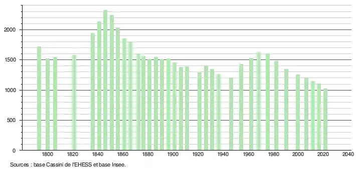 L'évolution du nombre d'habitants est connue à travers les recensements de la population effectués dans la commune depuis 1793. Pour les communes de moins de 10 000 habitants, une enquête de recensement portant sur toute la population est réalisée tous les cinq ans, les populations légales des années intermédiaires étant quant à elles estimées par interpolation ou extrapolation[41]. Pour la commune, le premier recensement exhaustif entrant dans le cadre du nouveau dispositif a été réalisé en 2006[42].