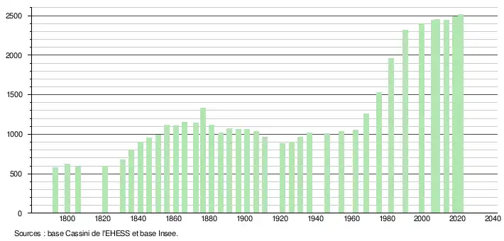 L'évolution du nombre d'habitants est connue à travers les recensements de la population effectués dans la commune depuis 1793. Pour les communes de moins de 10 000 habitants, une enquête de recensement portant sur toute la population est réalisée tous les cinq ans, les populations légales des années intermédiaires étant quant à elles estimées par interpolation ou extrapolation[24]. Pour la commune, le premier recensement exhaustif entrant dans le cadre du nouveau dispositif a été réalisé en 2008[25].