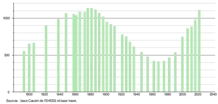 L'évolution du nombre d'habitants est connue à travers les recensements de la population effectués dans la commune depuis 1793. Pour les communes de moins de 10 000 habitants, une enquête de recensement portant sur toute la population est réalisée tous les cinq ans, les populations légales des années intermédiaires étant quant à elles estimées par interpolation ou extrapolation[17]. Pour la commune, le premier recensement exhaustif entrant dans le cadre du nouveau dispositif a été réalisé en 2006[18].