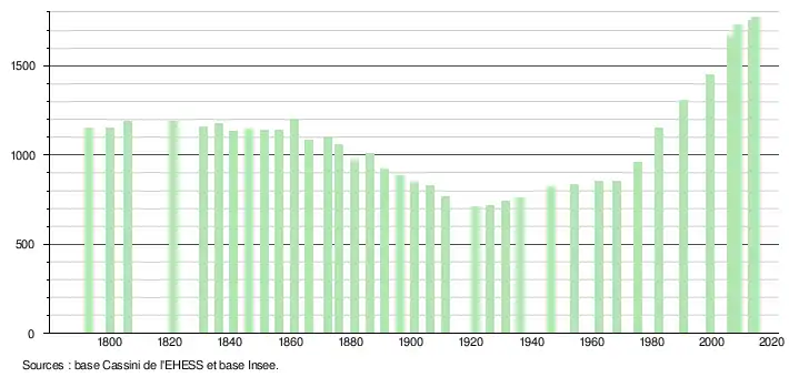 L'évolution du nombre d'habitants est connue à travers les recensements de la population effectués dans la commune depuis 1793. Pour les communes de moins de 10 000 habitants, une enquête de recensement portant sur toute la population est réalisée tous les cinq ans, les populations légales des années intermédiaires étant quant à elles estimées par interpolation ou extrapolation[10]. Pour la commune, le premier recensement exhaustif entrant dans le cadre du nouveau dispositif a été réalisé en 2008[11].