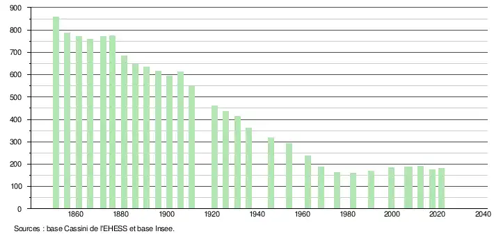 L'évolution du nombre d'habitants est connue à travers les recensements de la population effectués dans la commune depuis 1851. Pour les communes de moins de 10 000 habitants, une enquête de recensement portant sur toute la population est réalisée tous les cinq ans, les populations légales des années intermédiaires étant quant à elles estimées par interpolation ou extrapolation[16]. Pour la commune, le premier recensement exhaustif entrant dans le cadre du nouveau dispositif a été réalisé en 2007[17].