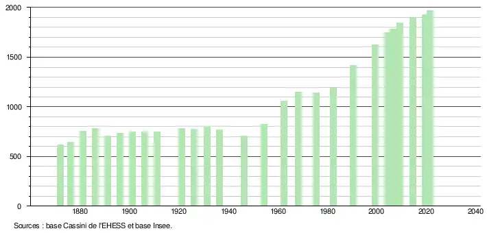 L'évolution du nombre d'habitants est connue à travers les recensements de la population effectués dans la commune depuis 1872. Pour les communes de moins de 10 000 habitants, une enquête de recensement portant sur toute la population est réalisée tous les cinq ans, les populations légales des années intermédiaires étant quant à elles estimées par interpolation ou extrapolation[24]. Pour la commune, le premier recensement exhaustif entrant dans le cadre du nouveau dispositif a été réalisé en 2004[25].