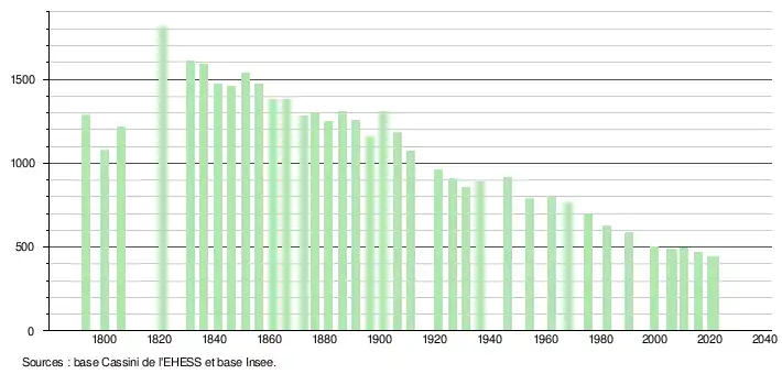 L'évolution du nombre d'habitants est connue à travers les recensements de la population effectués dans la commune depuis 1793. Pour les communes de moins de 10 000 habitants, une enquête de recensement portant sur toute la population est réalisée tous les cinq ans, les populations légales des années intermédiaires étant quant à elles estimées par interpolation ou extrapolation[24]. Pour la commune, le premier recensement exhaustif entrant dans le cadre du nouveau dispositif a été réalisé en 2005[25].