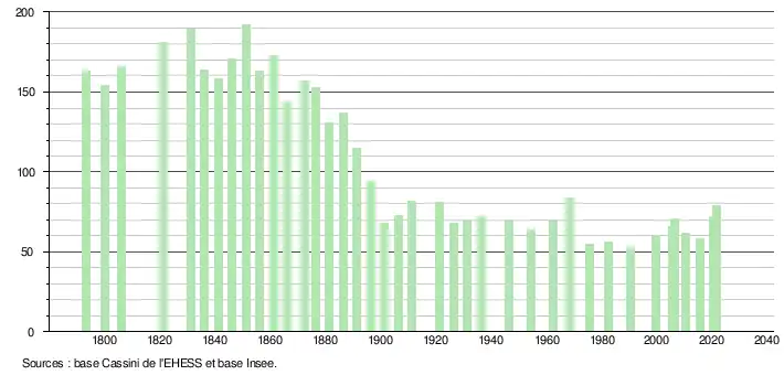 | L'évolution du nombre d'habitants est connue à travers les recensements de la population effectués dans la commune depuis 1793. Pour les communes de moins de 10 000 habitants, une enquête de recensement portant sur toute la population est réalisée tous les cinq ans, les populations légales des années intermédiaires étant quant à elles estimées par interpolation ou extrapolation[38]. Pour la commune, le premier recensement exhaustif entrant dans le cadre du nouveau dispositif a été réalisé en 2005[39]. En 2021, la commune comptait 79 habitants[Note 6], en augmentation de 36,21 % par rapport à 2015 (Ariège : +1,38 %, France hors Mayotte : +1,84 %). |